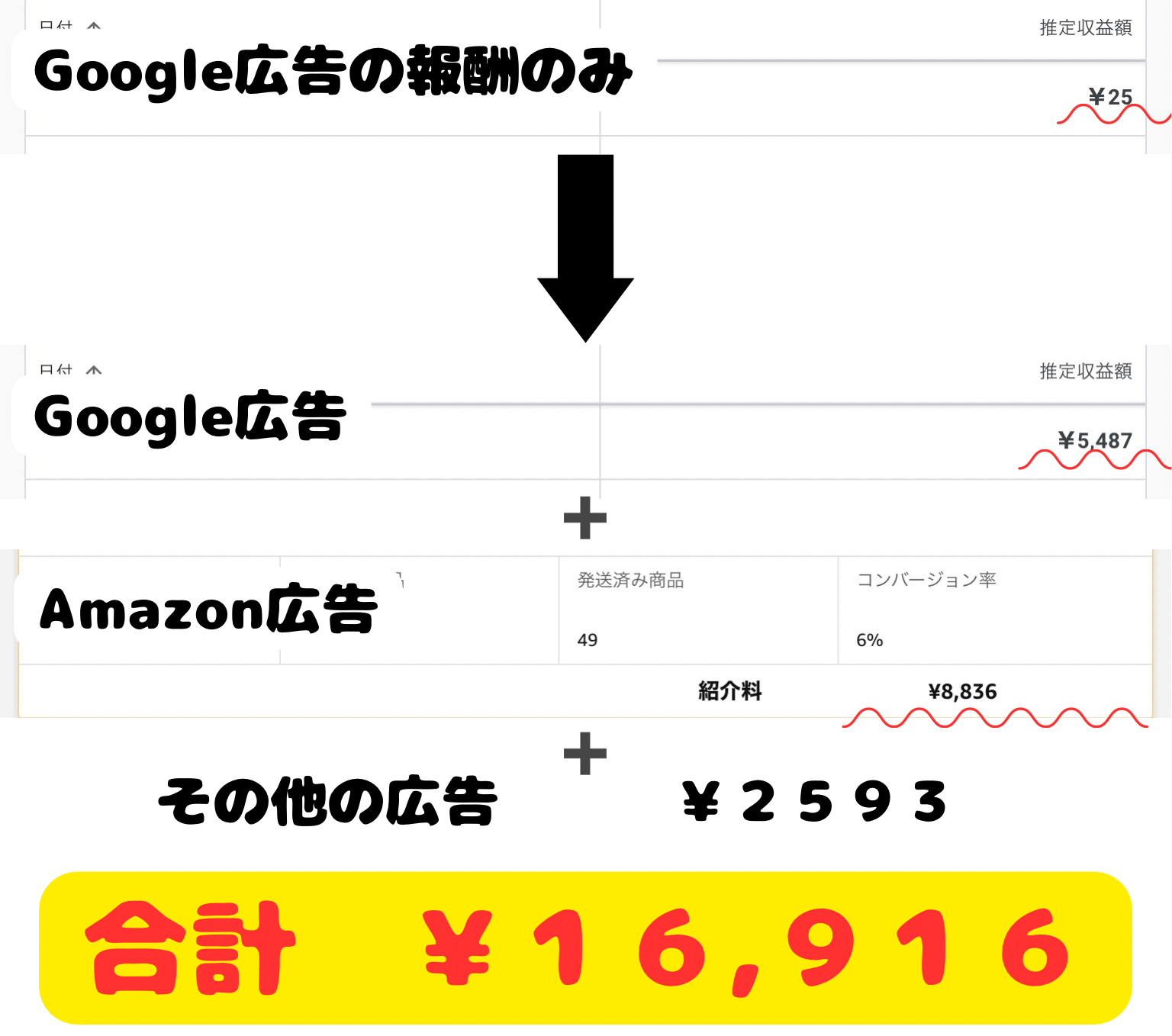 投稿した記事にアクセスが集まるようになったら、記事内に紹介したい商品の広告を掲載することで、上手くいけばその日からいきなり100円〜1000円の報酬が発生するようになります。